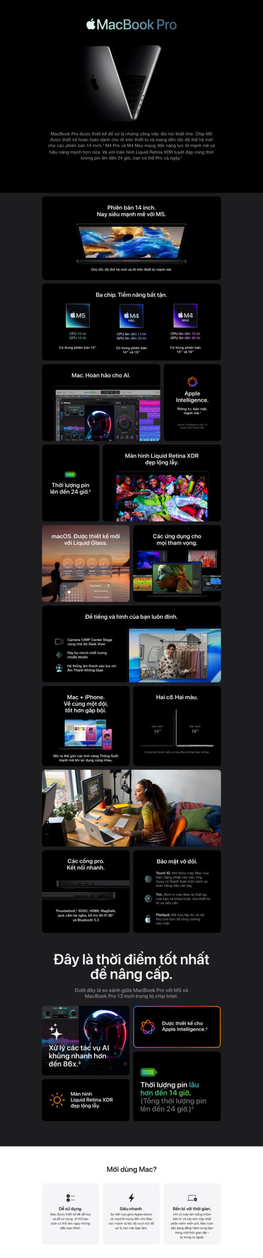 | Cổng giao tiếp | Hai cổng Thunderbolt / USB 4 (USB-C) Ba cổng Thunderbolt 4 (USB-C) Cổng HDMI Cổng HDMI Khe thẻ nhớ SDXC Jack 3.5mm |